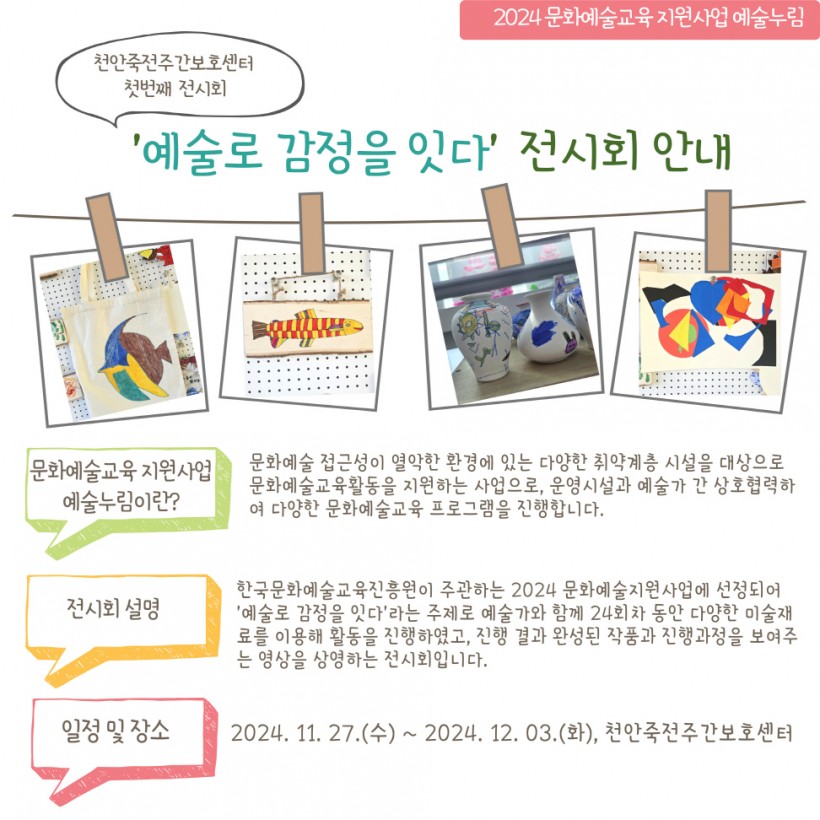 이번 전시회는 한국문화예술교육진흥원의 지원사업에 선정되어 '예술로 감정을 잇다"라는 주제로 진행한 미술활동을 통해 완성된 작품을 전시하고 진행과정을 보여주는 영상을 상영하는 전시회입니다.