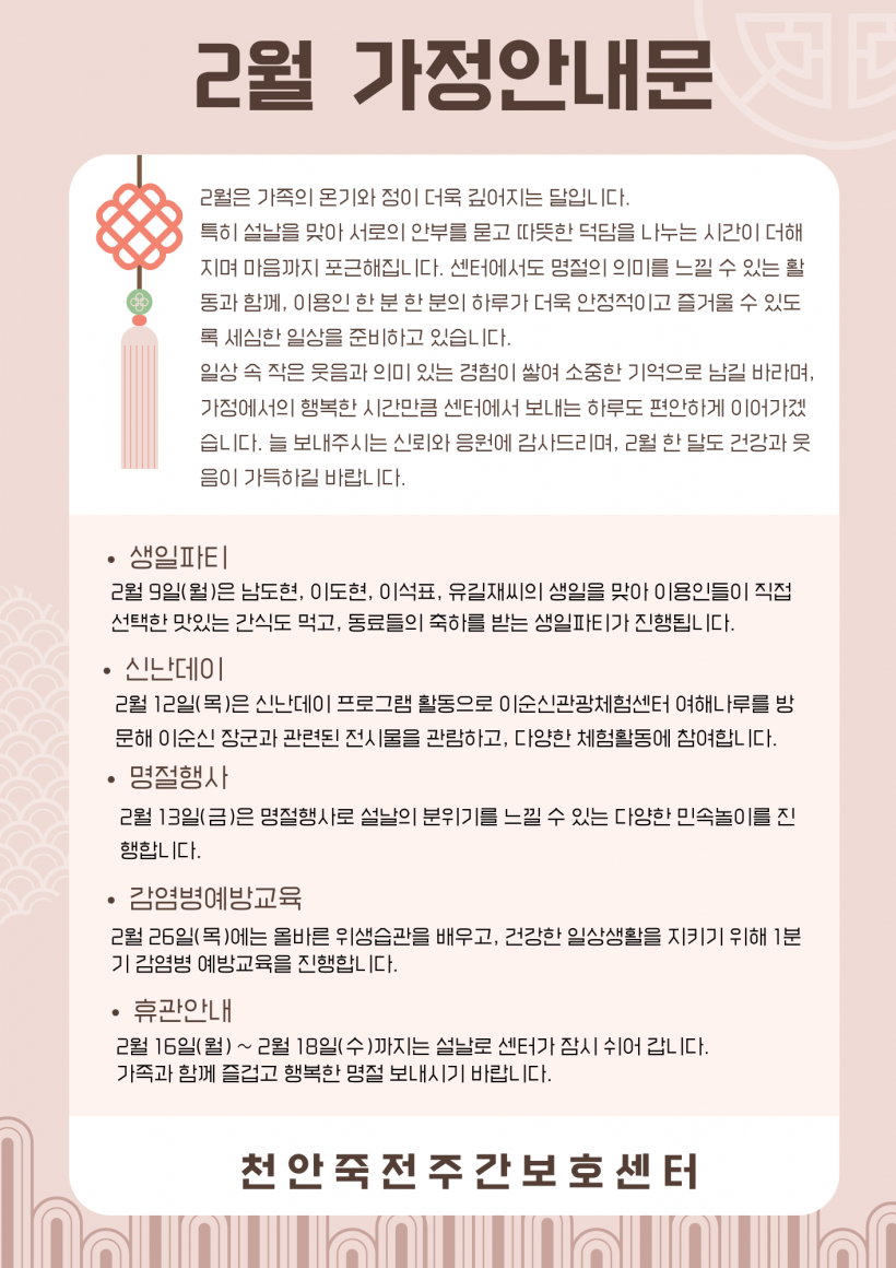 2026년 2월 가정안내문 페이지 정보 작성자 김미리 작성일26-01-29 16:17 조회165회 댓글0건 이전글 다음글 목록 본문 2월 가정안내문입니다. 댓글목록 등록된 댓글이 없습니다. 이전글 다음글 목록