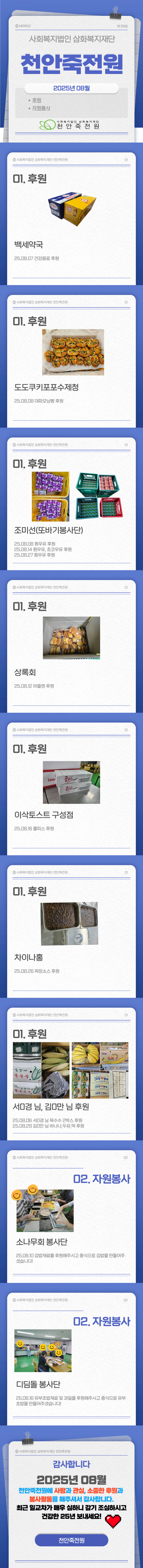 [8월] 후원 자원봉사 페이지 정보 작성자 운영자 작성일25-09-03 11:18 조회510회 댓글0건 관련링크 목록 본문 2025년 08월 한달동안 천안죽전원에 사랑과 나눔을 전달해주신 분들을 소개합니다!꾸준히 저희 천안죽전원에 관심을 가져주시고 사랑을 나눠주시는 이웃주민과 지역사회 주민분들이 계셔행복합니다 감사합니다! 댓글목록 등록된 댓글이 없습니다. 목록