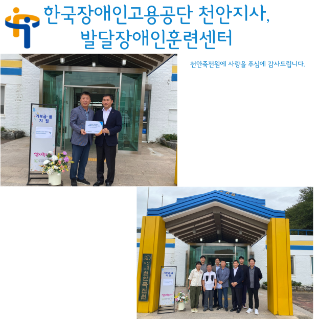 [후원]한국장애인고용공단 천안지사,발달장애인훈련센터 페이지 정보 작성자 운영자 작성일23-09-25 17:27 조회808회 댓글0건 관련링크 목록 본문 23.09.25(월)한국장애인고용공단 천안지사,발달장애인훈련센터에서 후원 방문을 해주셨습니다.다시한번 감사드립니다~! 댓글목록 등록된 댓글이 없습니다. 목록