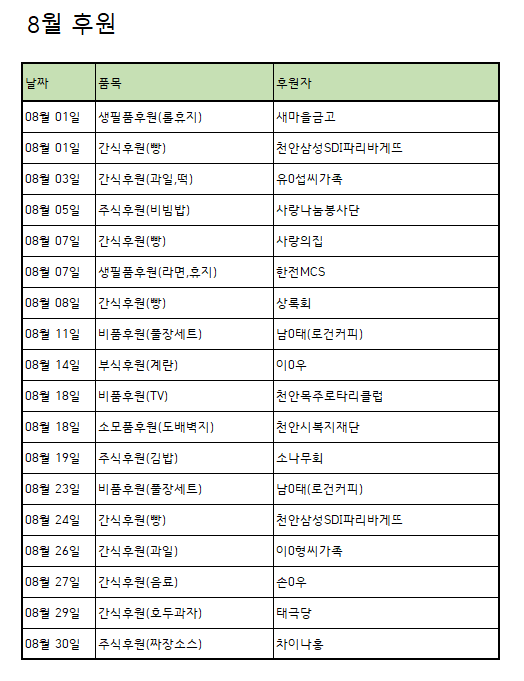 [후원] 8월 후원품 페이지 정보 작성자 운영자 작성일23-09-19 11:59 조회732회 댓글0건 관련링크 목록 본문 8월 후원해주신 모든 후원자님께 다시 한번 감사드립니다~! 댓글목록 등록된 댓글이 없습니다. 목록