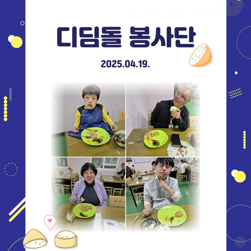[자원봉사] 디딤돌봉사단 페이지 정보 작성자 운영자 작성일25-04-22 11:14 조회566회 댓글0건 관련링크 목록 본문 25.04.19.(토)디딤돌봉사단이 천안죽전원에 오셔 봉사활동을 진행해주셨습니다.한 달에 한번씩 생각만해도 군침이 도는 맛있는 유부초밥을 만들어주십니다.항상 감사드립니다. 댓글목록 등록된 댓글이 없습니다. 목록