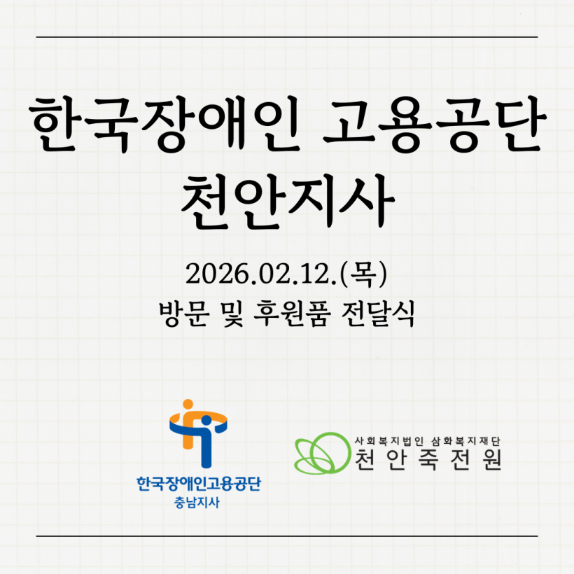 한국장애인고용공단 천안지사 방문 페이지 정보 작성자 운영자 작성일26-02-23 16:00 조회12회 댓글0건 관련링크 목록 본문 26.02.12.(목)한국장애인고용공단 천안지사에서 임직원분들이 방문해주셨습니다.항상 따뜻한 관심과 소중한 나눔을 해주시는 한국장애인고용공단 천안지사 임직원 분들께 감사드립니다. 댓글목록 등록된 댓글이 없습니다. 목록