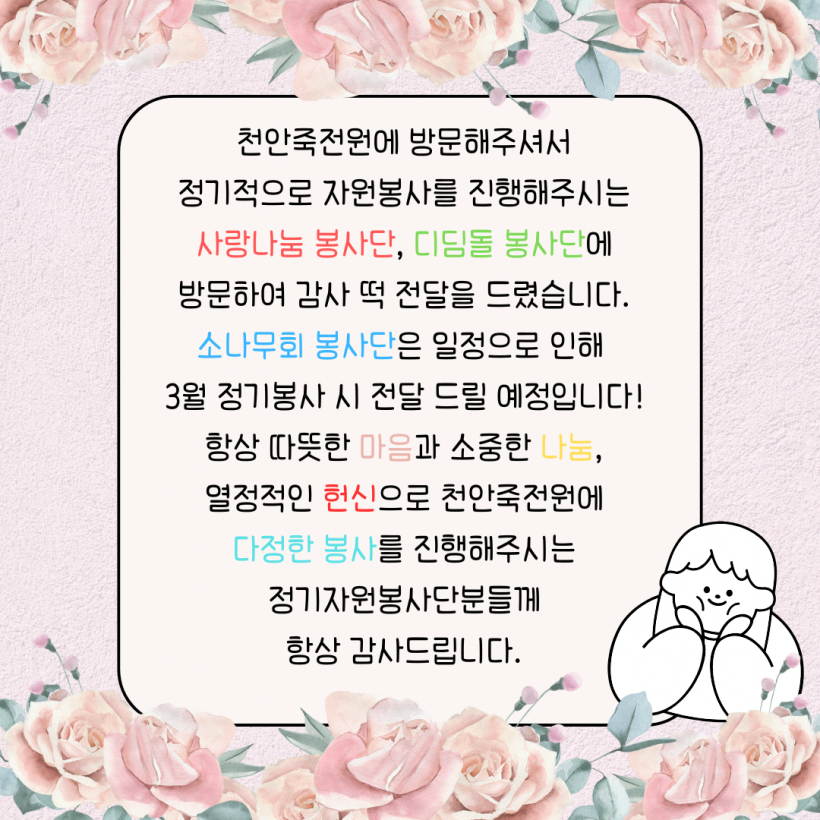 정기자원봉사단 감사 떡 전달 페이지 정보 작성자 운영자 작성일26-02-23 16:50 조회9회 댓글0건 관련링크 목록 본문 26.02.13.(금)설 명절을 앞두고 정기자원봉사단분들께 감사 떡을 전달드리고 왔습니다.이용자분들과 함께 방문하여 감사 인사를 드리고 감사 인사를 드렸습니다.항상 천안죽전원에 다정한 봉사를 진행해주시는 정기자원봉사단분들께다시한번 감사 인사를 드립니다. 댓글목록 등록된 댓글이 없습니다. 목록