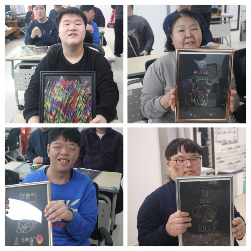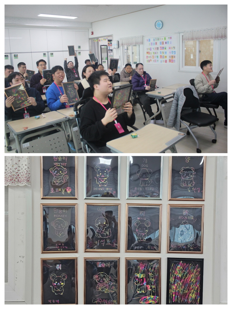 이용인들은 자신이 태어난 띠를 스크래치 페이퍼에 표현하며, 긁을 때마다 나타나는 알록달록한 색처럼 각자의 개성과 이야기를 자유롭게 풀어내며, 단순한 그림 그리기를 넘어, 나를 소개하고 나를 표현하는 소중한 시간이 되었습니다.